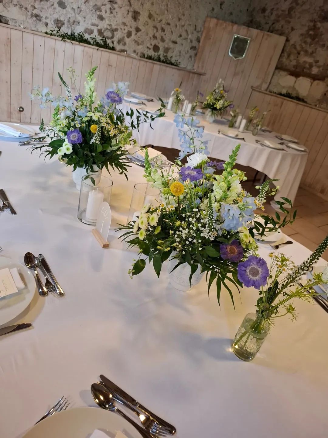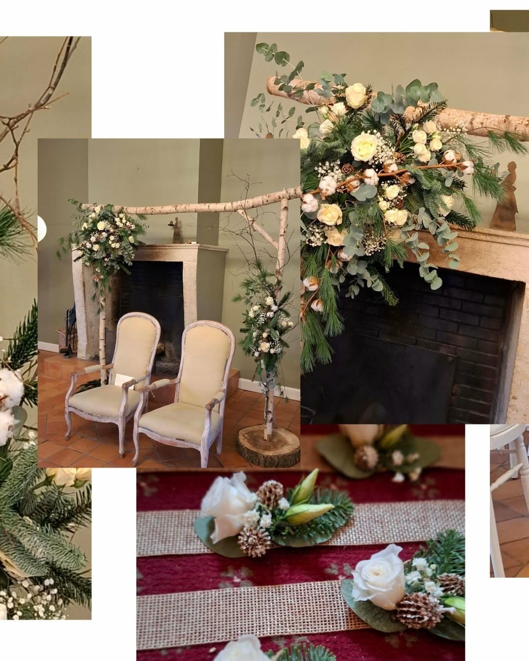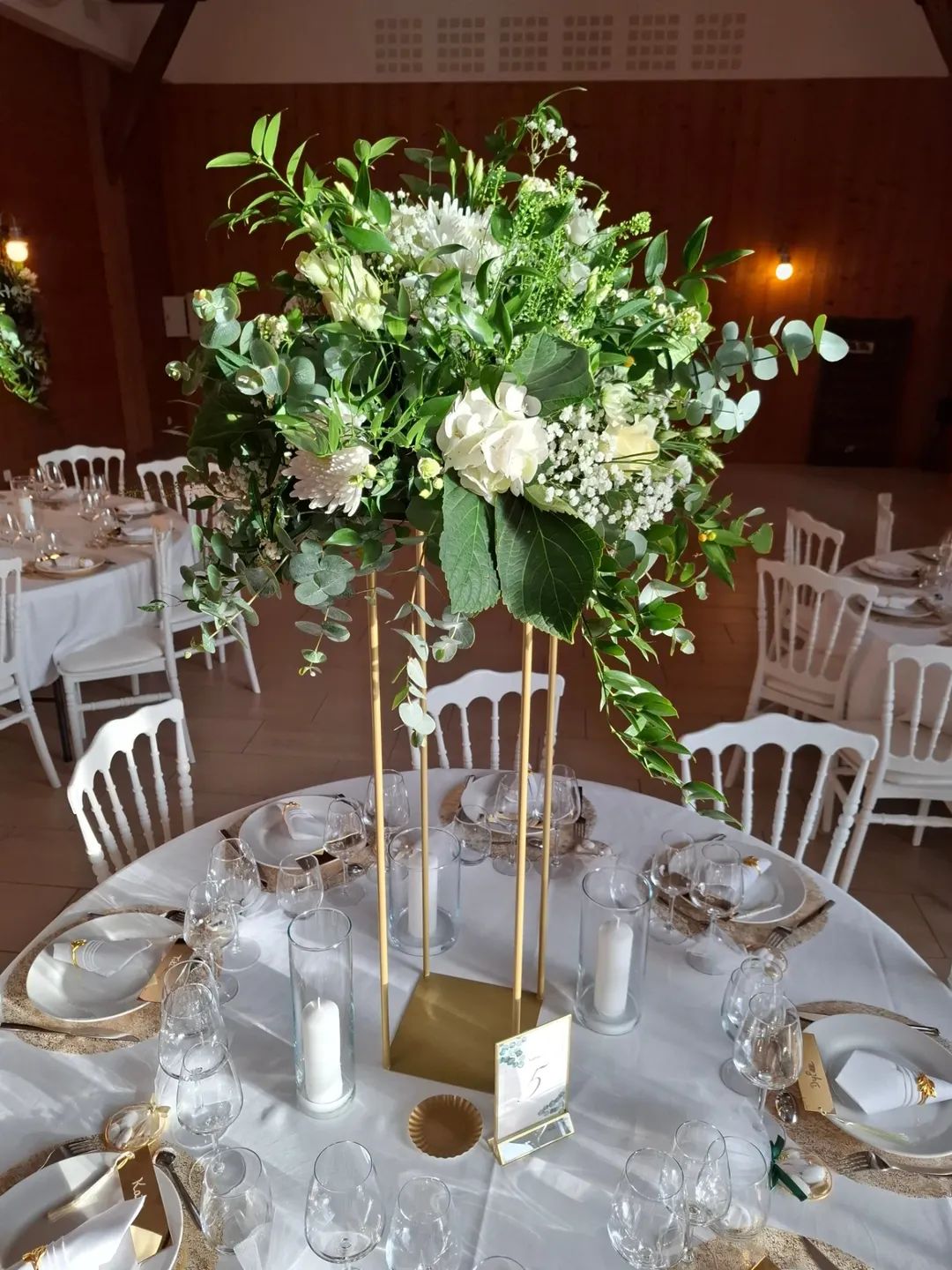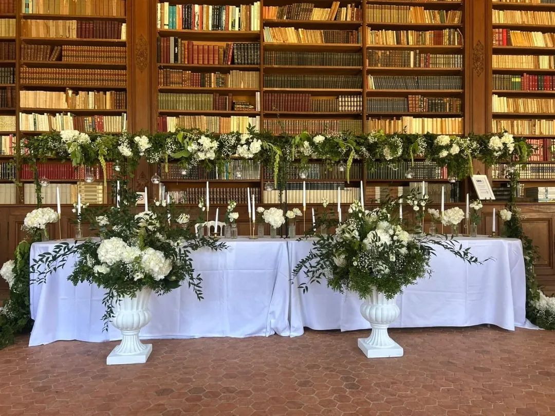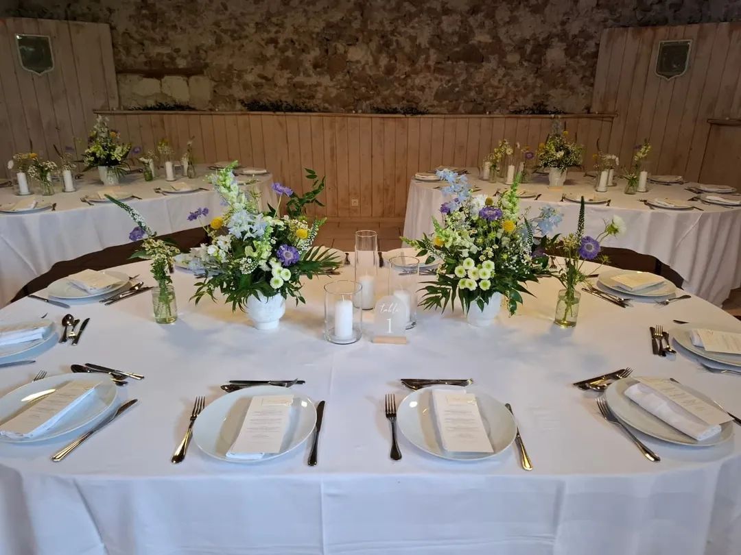 Pour la réception, nous réalisons la décoration florale de la salle : centres de table, compositions pour la table d’honneur, espaces clés et éléments décoratifs en fleurs.